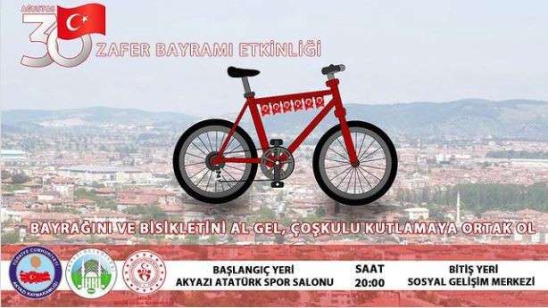 Akyazı belediyesi, 30 Ağustos Zafer Bayramının 99. yılında bisiklet turuna halkı davet ediyor. Akyazı Kaymakamlığımız ve İlçe Spor Müdürlüğümüz işbirliğinde Akyazı Atatürk Spor Salonu önünden başlayıp, Akyazı Sosyal Gelişim Merkezinde son bulunacak bisiklet turu halka açık olacak. Akyazı beklediyesi sosyal medya hesabından yaptığı paylaşımda Bayrağını bisikletini al çoşkulu kutlamaya sende ortak ol sloganıyla tüm halkımızı etkinliğe davet etti.