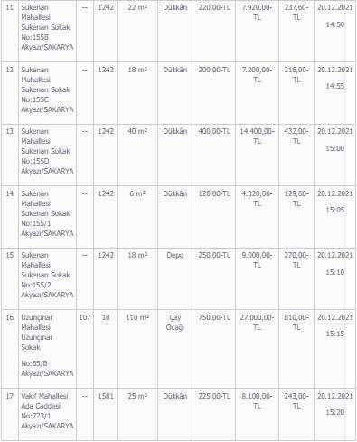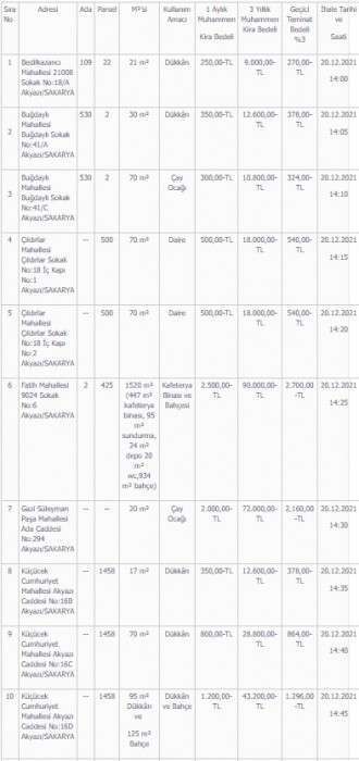 - Akyazı Belediyesine borcu olmadığına dair belge. (Mali Hizmetler Müdürlüğünden) İşte kiraya verilecek yerler ve kira bedelleri; "