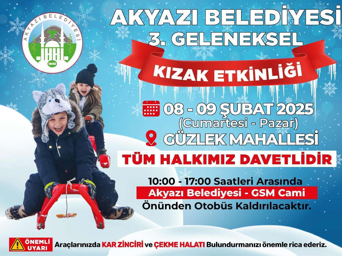 Akyazı Belediye Başkanı Bilal Soykan, Aktepe Kızak Merkezi’nde 8-9 Şubat tarihlerinde gerçekleştirilecek olan Akyazı Belediyesi 3. Geleneksel Kızak Etkinliğine tüm vatandaşları davet etti.