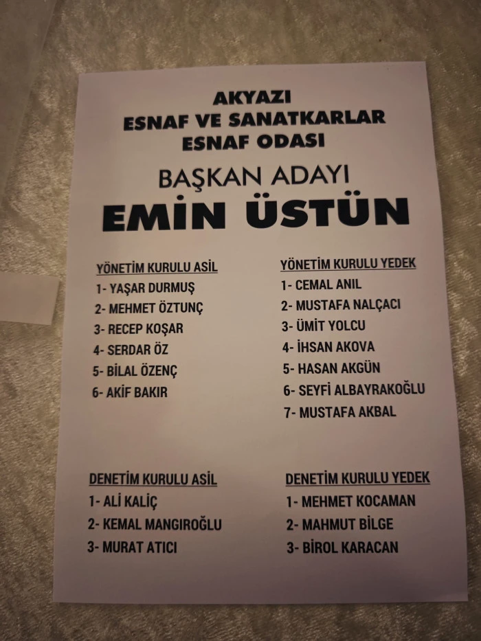 Akyazı esnafının heyecanla beklediği Akyazı Esnaf ve Sanatkârlar Odası Olağan Kongresi tamamlandı. Mevcut Başkan Emin Üstün ve yönetim kurulunun tek liste olarak girdiği genel kurulda, esnafın tam desteği sandığa yansıdı.