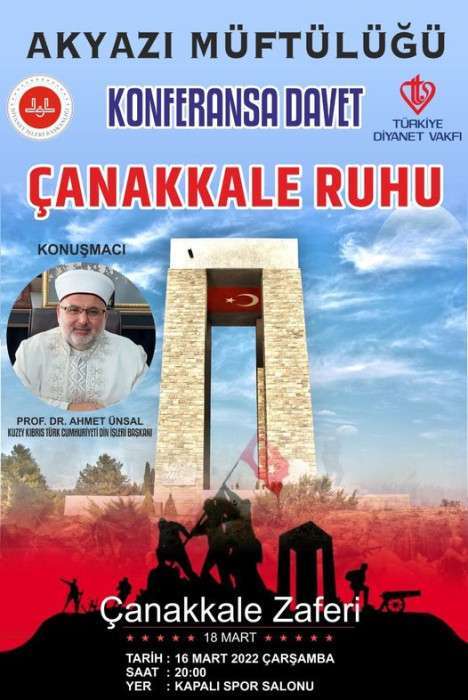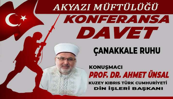 Akyazı İlçe müftülüğü tarafından düzenlenen Çanakkale Ruhu konulu konferans 16 Mart Çarşamba günü saat 20.00'de gerçekleşecek.Akyazı ilçe müftüsü Kamil Özcan Demir Kuzey Kıbrıs Türk Cumhuriyeti Din işleri Başkanı Prof. Dr. Ahmet Ünsal konuşmacı olarak katılacağı konferansa Akyazılı hemşehrilerimiz davetlidir dedi.