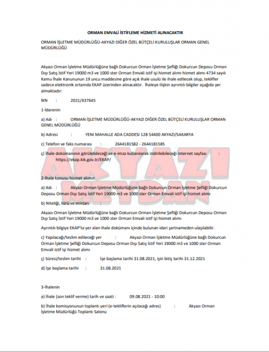 İhale saat 09.08.2021 tarihinde 10:00’da Akyazı Orman İşletme Müdürlüğü Toplantı Salonunda EKAP Üzerinden gerçekleşecek.