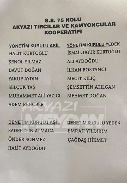 Kooperatif binasında yapılan kongrede Halit Kurtoğlu ve Erol Özgür aday olurken eski başkan Şenol Yılmaz ise Kurtoğlunun listesinde yer aldı. Yapılan seçimler sonucunda oyların çoğunu alan Halit Kurtoğlu Akyazı 75.nolu Tırcılar ve Kamyoncular kooperatifinin yeni başkanı seçildi.