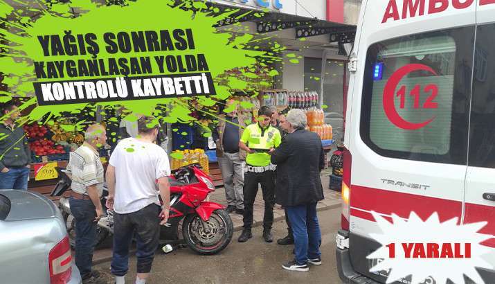 Ada caddesi yenicamide meydana gelen trafik kazasında yağış sonrasında isimleri öğrenilemeyen iki kişi motosiklet ile Akyazı çarşı yönüne seyir halindeyken kayganlaşan yolda sürücüsünün hâkimiyeti kaybetmesi neticesinde kayarak savruldu. Savrulan motosiklet park halindeki araca arkadan çarptı. Kazada motosiklette yolcu olarak bulunan genç yaralandı. Kaza haber verilmesi üzerine olay yerine sağlık ve polis ekipleri sevk edildi.