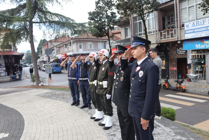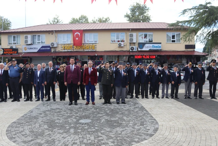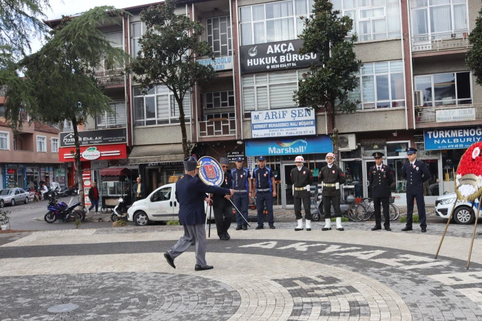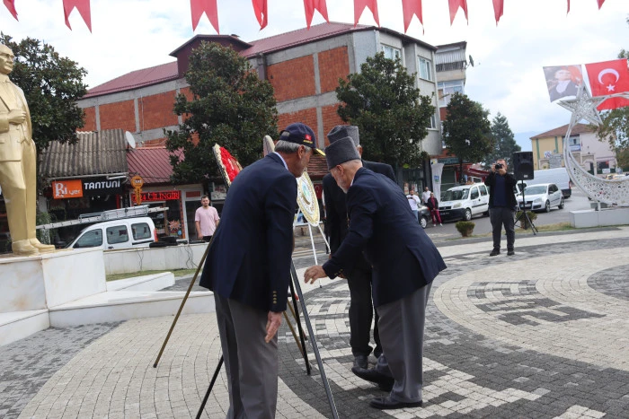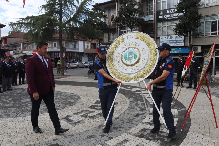 Saat 10.00'da başlayan törende Kaymakamlık, Garnizon Komutanlığı, Belediye Başkanlığı ve Türkiye Muharip Gaziler Derneği Akyazı Temsilciliği tarafından Atatürk Anıtı'na çelenk sunuldu. Tören, saygı duruşu ve İstiklal Marşı'nın okunmasıyla devam etti.