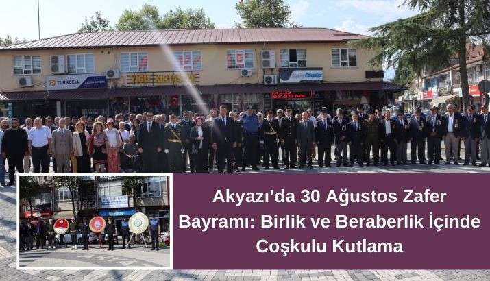 Akyazı’da 30 Ağustos Zafer Bayramı, Kaymakam Vekili ve Karapürçek Kaymakamı Kübra Baka Kılıç, Akyazı Belediye Başkanı Bilal Soykan, Akyazı İlçe Jandarma Komutanı Sinan Gönaylı, 7. Komando Tugay Komutanlığı'nda görevli Akyazılı İstihkam Yüzbaşı Osman Kılıçoğlu, Akyazı Gençlik ve Spor Müdürü Adem Altun, Akyazı Muhtarlar Derneği Başkanı Ahmet Savaş, Akyazı siyasi ilçe başkanları, STK temsilcileri ve gazilerin katılımıyla kutlandı.