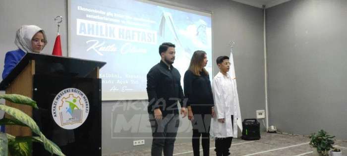 Akyazı Madeni Sanatkarlar Meslek Odası Başkanının konuşmasıyla devam eden törende, 9. sınıf öğrencileri Ahilik Yemini etti. Ahilik geleneği ile ilgili belgesel gösterimi yapılırken, mezun olan öğrenciler önlüklerini 9. sınıf öğrencilerine teslim etti. Programda yılın çırağı, yılın kalfası ve yılın ahisi ödülleri sahiplerini buldu. Yılın ahisi seçilen demir doğrama ustası Mümin Akgün’e kaftanı, Akyazı Kaymakamı Mustafa İkbal Eşki tarafından giydirildi.