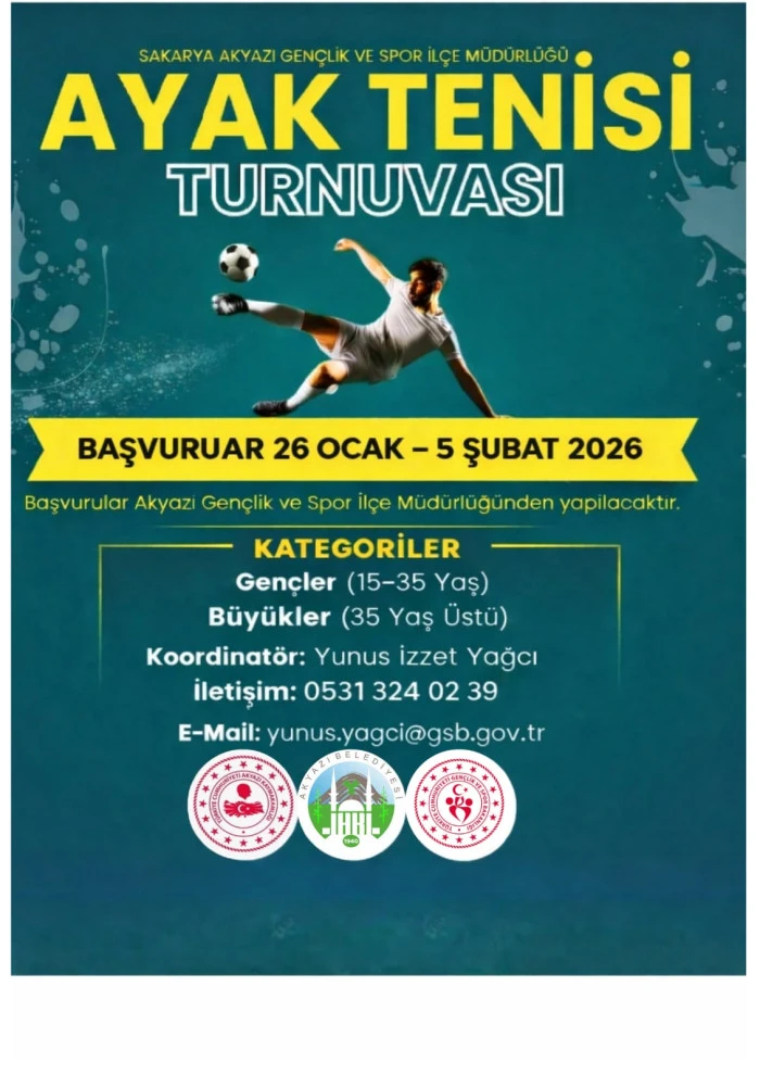 Akyazı Gençlik ve Spor İlçe Müdürlüğü, ilçedeki spor kültürünü yaygınlaştırmak ve her yaştan vatandaşı sporla buluşturmak amacıyla "Ayak Tenisi Turnuvası" düzenliyor. Sosyal etkileşimi artırması ve rekabet dolu anlara sahne olması beklenen turnuva için geri sayım başladı.
