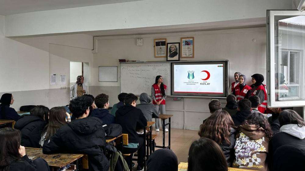 1 ile 7 Mart tarihleri arasındaki deprem haftası çerçevesinde gerçekleştirilen etkinlikte öğrencilere depremin olası etkileri ve Kızılay'ın rolü üzerine bilgiler aktarıldı.