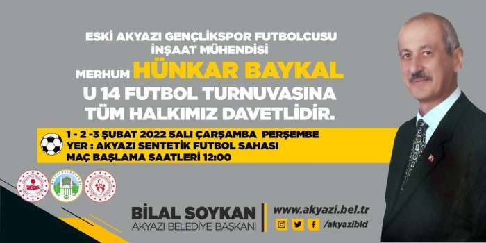 Akyazı Kaymakamlığı, Akyazı Belediyesi ve Gençlik Spor İlçe Müdürlüğü tarafından eski Akyazı Gençlikspor Futbolcusu Merhum Hünkar Baykal anısına futbol turnuvası düzenlenecek.