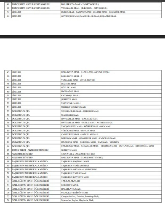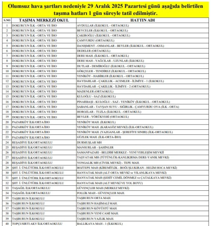 Müdürlükten yapılan açıklamaya göre, 29 Aralık 2025 Pazartesi günü aşağıda belirtilen merkezlere öğrenci taşıyan hatlar 1 gün süreyle tatil edilmiştir: