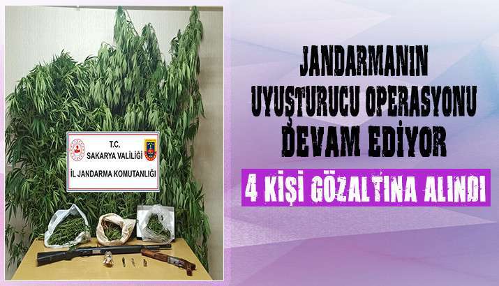 İl jandarma Komutanlığı İstihbarat Şube Müdürlüğü, KOM Müdürlüğü ve Akyazı İlçe Jandarma Komutanlığı ekipleri, Vakıf ve Yağcılar Mahallelerinde ikamet eden E.G., G.A. E.A. ve E.Ö. İsimli şahısların uyuşturucu ticareti yaptıklarını belirledi. Harekete geçen jandarma şüphelilerin adreslerine operasyon düzenledi. Şüphelilerin ev ve eklentileri ile bahçelerinde yapılan aramalarda 5 kilo kubar esrar, 40 kök kenevir, 2 adet ruhsatsız av tüfeği, 4 adet uyuşturucu kullanma aparatı ele geçirildi. Şüpheliler gözaltına alındı.