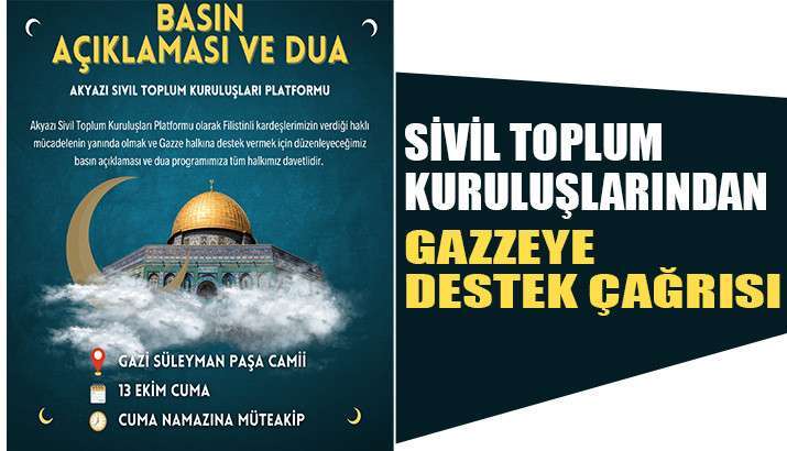 Platformdan yapılan açıklamada; "Akyazı Sivil Toplum Kuruluşları olarak Filistinli kardeşlerimizin verdiği haklı mücadelenin yanında olmak ve Gazze halkına destek vermek için 13 Ekim Cuma günü Gazi Süleyman Paşa Camii önünde Cuma namazına müteakip düzenleyeceğimiz basın açıklaması ve dua programına tüm halkımız davetlidir" denildi.