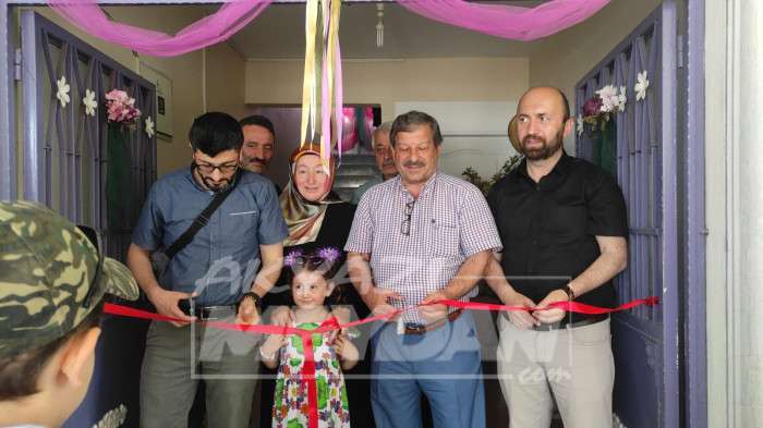 Halk Eğitim Usta Öğreticisi Gülümser Çolak'ın 33 kursiyer öğrencisinin yaklaşık 150 ürününün sergilendiği açılış kurdelasını Halk eğitim müdürü Dursun Ali Yaman,İlçe Milli Eğitim Şube Müdürü Ramazan Şerbetçi,Halk Eğitim Merkezi Müdür yardımcısı Salih Balsatar ,usta öğretici Gülümser Çolak ve çocukları birlikte kestiler.