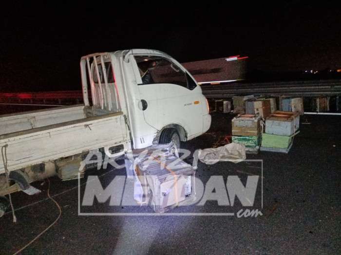 Kamyonet, sürücüsünün direksiyon hakimiyetini kaybetmesi sonucu bariyerlere çarptı. Kazada kamyonetteki kovanlar yola saçıldı.