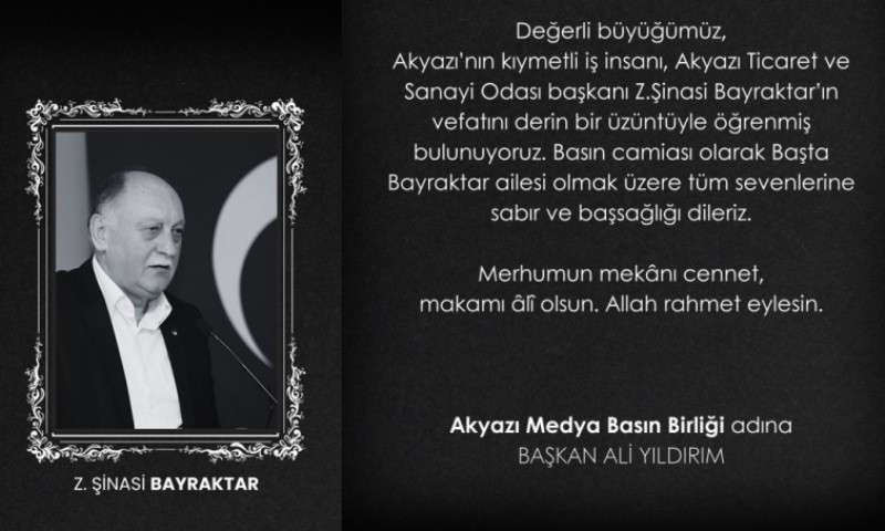 Değerli büyüğümüz, Akyazı’nın kıymetli iş insanı, Akyazı Ticaret ve Sanayi Odası başkanı Z.Şinasi Bayraktar’ın vefatını derin bir üzüntüyle öğrenmiş bulunuyoruz. Basın camiası olarak Başta Bayraktar ailesi olmak üzere tüm sevenlerine sabır ve başsağlığı dileriz.