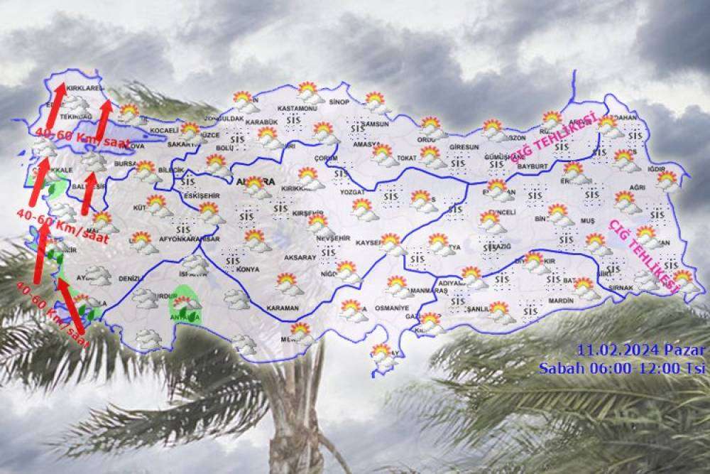 Bu arada günlük tahmini rapora göre Meteoroloji, Marmara'nın batısı ile Kıyı Ege’de güneyli yönlerden kuvvetli (40-70 km/saat) esmesi beklendiğinden yaşanabilecek olumsuzluklara karşı dikkatli ve tedbirli olunmasını isterken, Doğu Karadeniz’in yüksekleri ile Doğu Anadolu’nun doğusunda yüksek kar örtüsüne sahip eğimli bölgelerde çığ riski bulunduğundan dikkatli ve tedbirli olunması konusunda uyarıda bulundu.