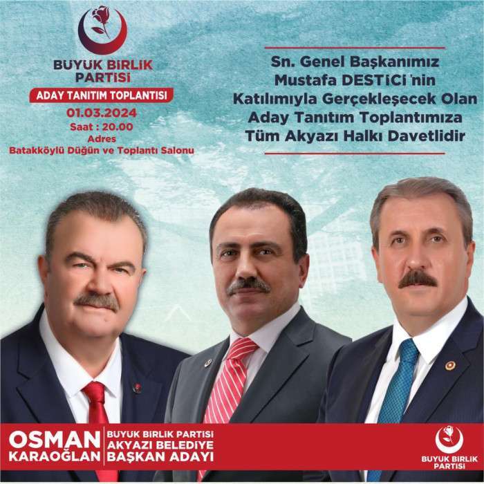 Büyük Birlik Partisi Genel Başkanı Mustafa Desteci aday tanıtım programı için Akyazı’ya geliyor.