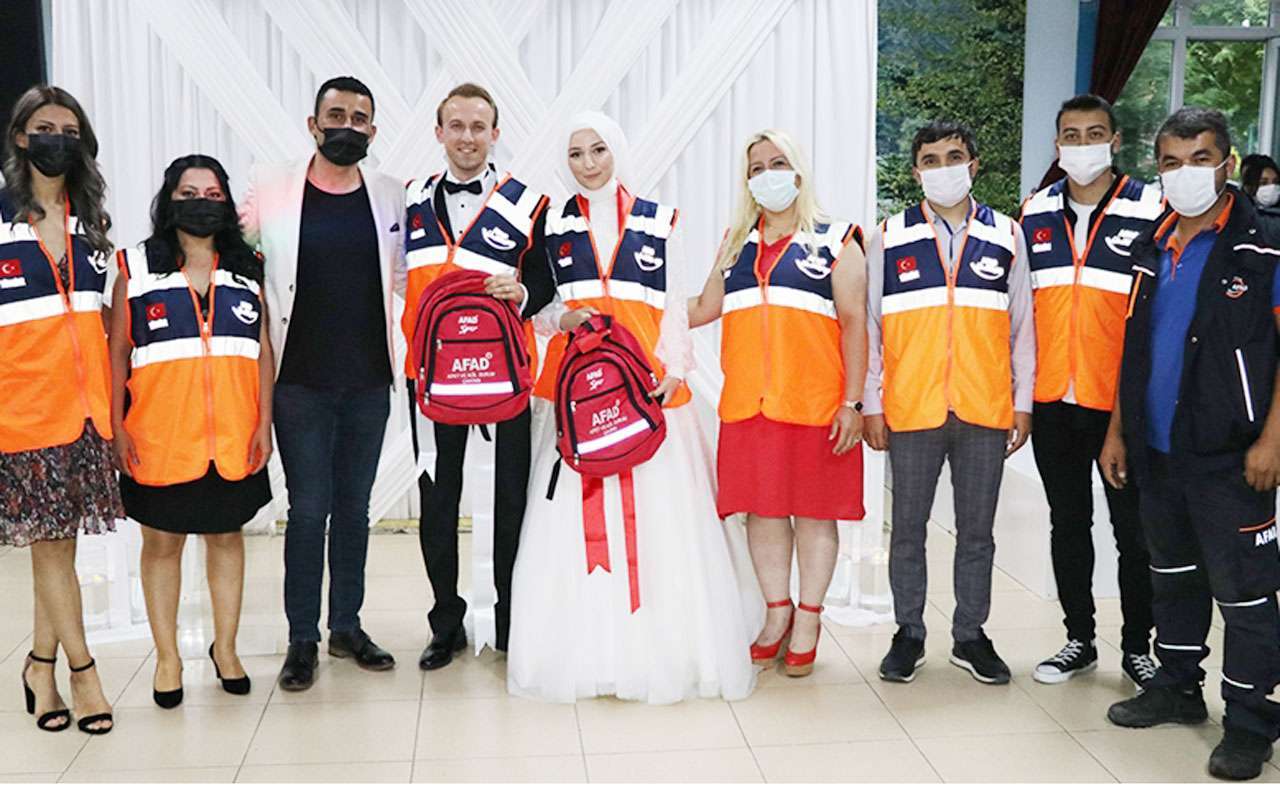 Bolu'da Afet ve Acil Durum Yönetimi (AFAD) gönüllüsü gelin ve damada takı olarak "Afet ve acil durum çantası" hediye edildi.