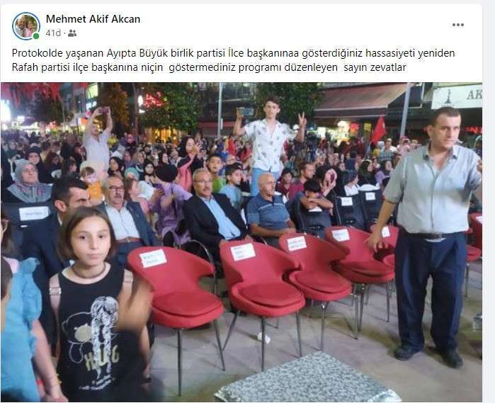 Akyazı’da düzenlenen 15 Temmuz Milli Birlik ve Dayanışma Gününde Protokol sıralaması ve düzenine tepki çeken Yeniden Refah Partisi Alanı terk etmişti.