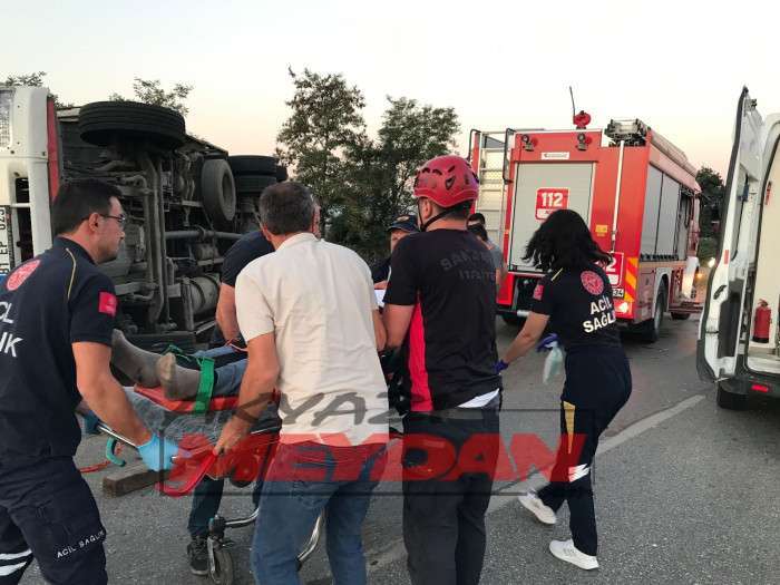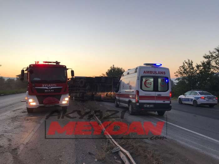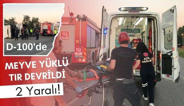 D-100 Karayolu Akyazı’da meyve yüklü tır devrildi, 2 kişi yaralandı. Araçta sıkışan bir yaralı itfaiye ekiplerince uzun uğraşlar sonucu kurtarıldı.
