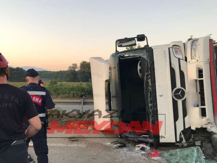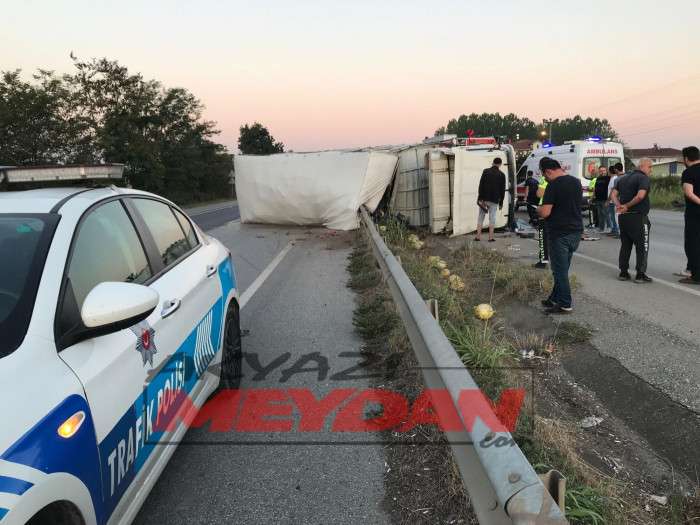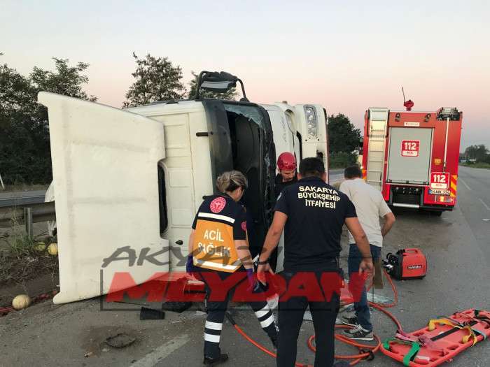 D-100 Karayolu’nun Akyazı kesiminde meyve yüklü bir kamyon, bariyerlere çarparak devrildi. Kazada iki kişi yaralandı, biri araçta sıkıştı.