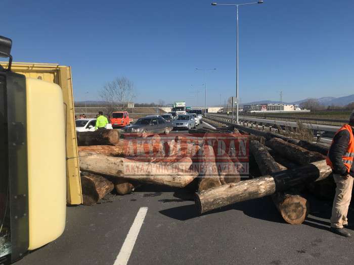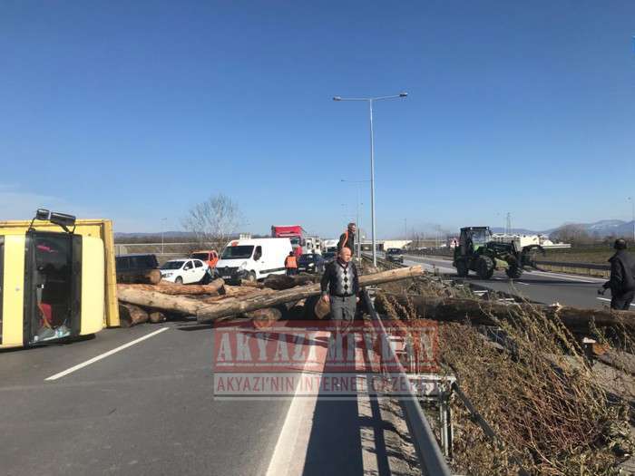 D140 karayolu D100 bağlantı noktasında meydana gelen kazada tomruklar yola saçıldı trafik durdu.
