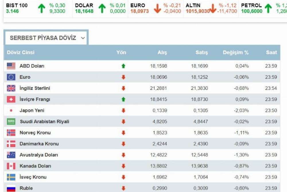 Dolar, serbes piyasada alış 18.15, satış 18.16 olurken, euro ise alış 18.06, satış 18.12 oldu.