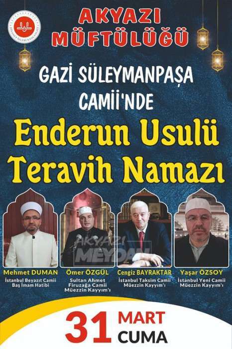 Her dört rekatın farklı makamlarda kılındığı ve bu makamların ilahilerle süslendiği, müezzinlerin ise makamlar arasında geçişi salavat eşliğinde yaptığı bir Osmanlı Enderun Mektebi geleneğini 31 Mart Cuma Günü Akşamı Merkez Gazi Süleymanpaşa Camii’nde kılınacak enderun teravih namazını İstanbul Beyazıt camii Baş imamı Mehmet Duman, Sultan Ahmet Camii Müezzin Kayyım’ı Ömer Özgül, İstanbul Taksim Camii Müezzin Kayyım’ı Cengiz Bayraktar, İstanbul Yeni Camii Müezzin Kayyım’ı Yaşar Özsoy kıldıracak.