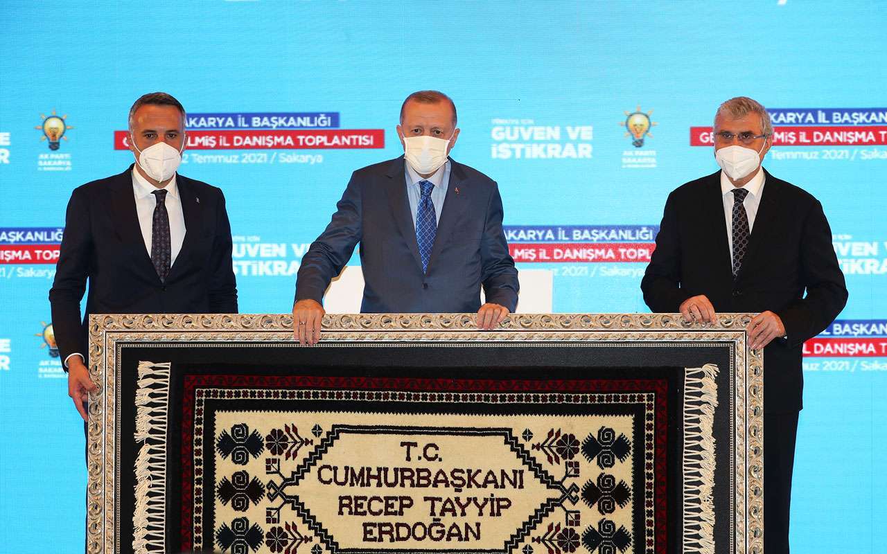 Başkan Yüce, toplantının sonunda Cumhurbaşkanı Erdoğan’a üzerinde isminin yazılı olduğu Sakarya’da üretilen yağcıbedir halısını takdim etti.
