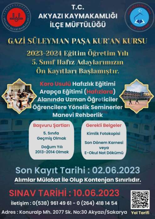 Akyazı Gazi Süleymanpaşa Kur’an kursu 2023-2024 Eğitim öğretim yılı 5. Sınıf Hafız adaylarının ön kayıtları başladı.
