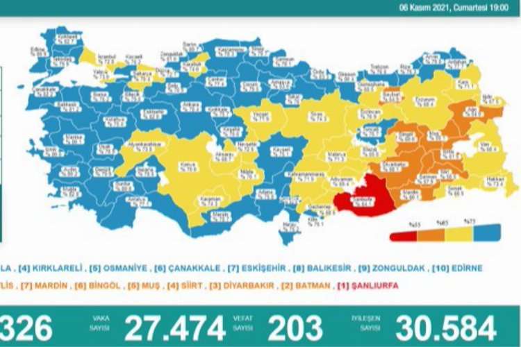 BURSA (İGFA)- Sağlık Bakanı Fahrettin Koca resmi sosyal medya hesabından yaptığı paylaşımda, günlük vaka sayısının 27 bin 474, yapılan test sayısının 358 bin 326, iyileşen hasta sayısının 30 bin 584 ve vefat edenlerin sayısının 203 olduğunı açıkladı.
