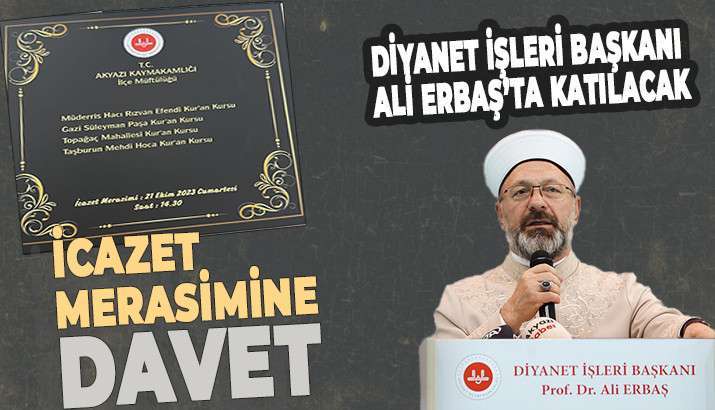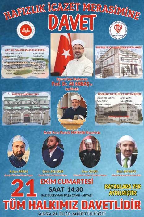Akyazı İlçe müftülüğü Akyazı’da eğitim veren 5 Kur-an kursunda yetişen 75 öğrenci için Gazisüleymanpaşa camiinde düzenlenecek olan hafızlık icazet merasimine Akyazılıları davet etti.