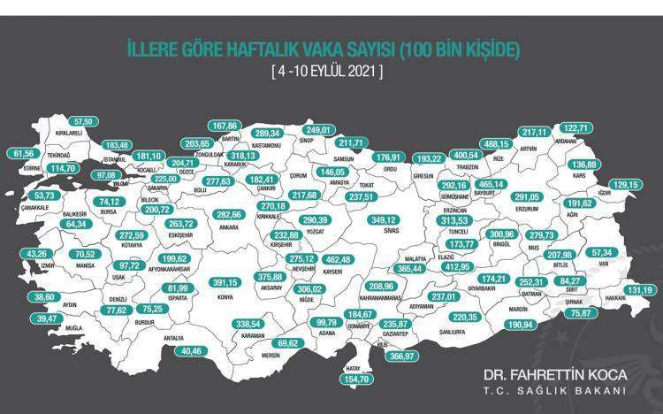 Sağlık Bakanlığı, 4-10 Eylül arasında 100 bin kişide görülen haftalık vaka haritasını açıkladı. Rize, 488,15 ile en fazla vakanın görüldüğü il oldu.