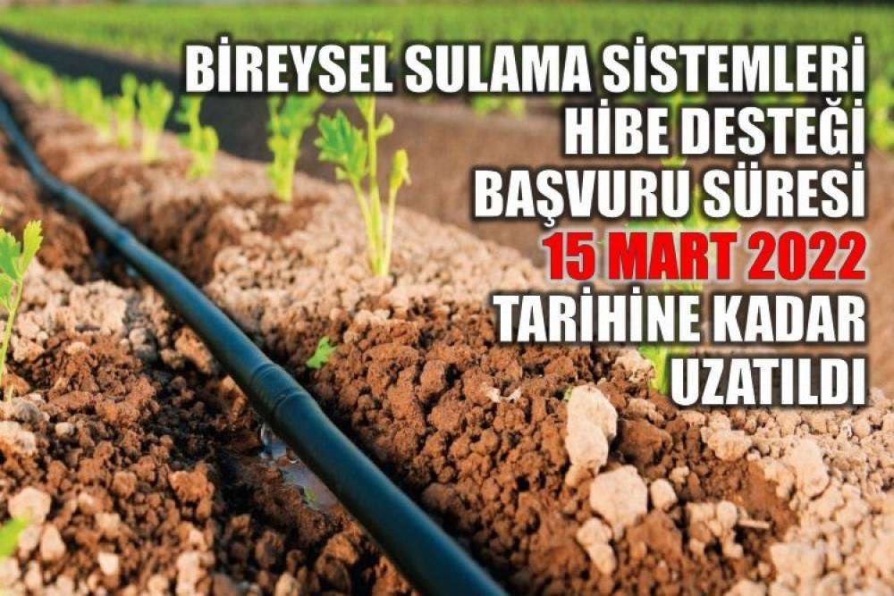 Resmi Gazete'de yayımlanan tebliğe göre; Bireysel sulama sistemleri hibe desteği başvuru süresi 15 Mart 2022 tarihine kadar uzatıldı. 15 Mart 2022 tarihine kadar uzatılan hibe desteği başvuru süresi yanı gün mesai saati bitimine kadar devam edecek. Resmi Gazete'de yapılan düzenlemeyle birlikte daha önce destek kategorisinde yer almayan, Akıllı sulama sistemler kurulumu da hibe desteğine dahil edildi.