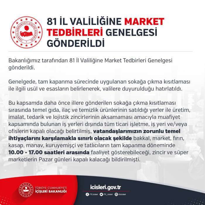 Bu kapsamda daha önce illere gönderilen sokağa çıkma kısıtlaması sırasında temel gıda, ilaç ve temizlik ürünlerinin satıldığı yerler ile üretim, imalat, tedarik ve lojistik zincirlerinin aksamaması amacıyla muafiyet kapsamında bulunan iş yerleri dışında tüm ticari işletme, iş yeri ve/veya ofislerin kapalı olacağı belirtilmiş, vatandaşlarımızın zorunlu temel ihtiyaçlarını karşılamakla sınırlı olacak şekilde bakkal, market, fırın, kasap, manav, kuruyemişçi ve tatlıcıların tam kapanma döneminde 10.00 - 17.00 saatleri arasında faaliyet gösterebileceği, zincir ve süper marketlerin Pazar günleri kapalı kalacağı bildirilmişti.