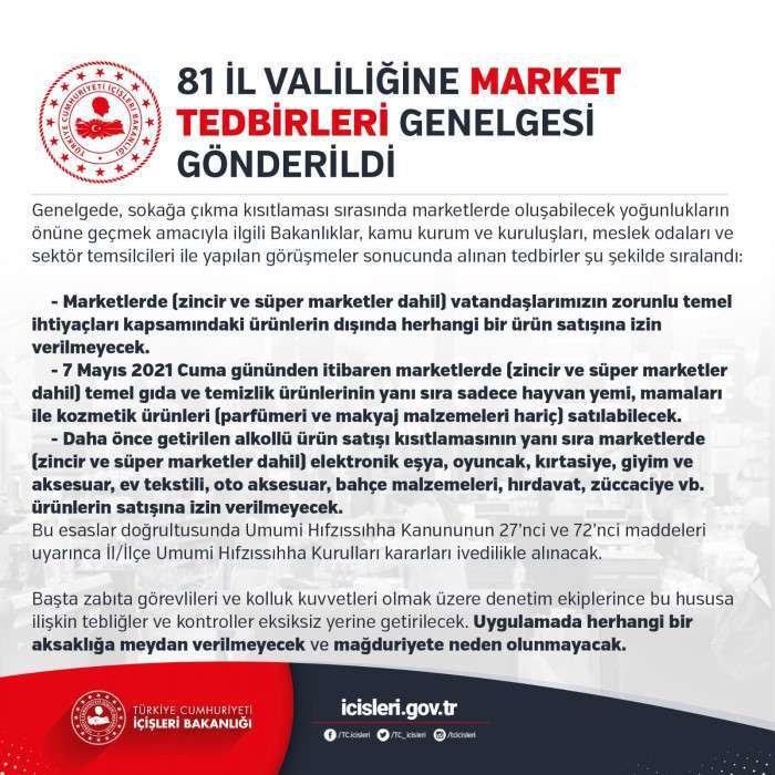 - 7 Mayıs 2021 Cuma gününden itibaren marketlerde (zincir ve süper marketler dahil) temel gıda ve temizlik ürünlerinin yanı sıra sadece hayvan yemi, mamaları ile kozmetik ürünleri (parfümeri ve makyaj malzemeleri hariç) satılabilecek.