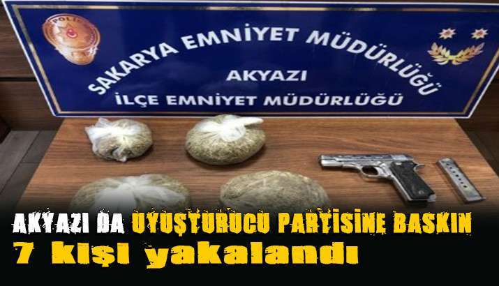 Akyazı İlçe Emniyet Müdürlüğü’ne bağlı ekipler, ilçe merkezinde boş bir evde uyuşturucu kullanıldığı bilgisini aldı. Harekete geçen polis, söz konusu eve operasyon yaptı. Operasyonda M. A, S. A, C. O.,H. Y.), M. T., M. A. Y. ve T. A. isimli 7 şahıs uyuşturucu kullanırken yakalandı. Gözaltına alınan 7 kişi hakkında uyuşturucu madde kullanmak ve bulundurmaktan adli işlem yapıldı.