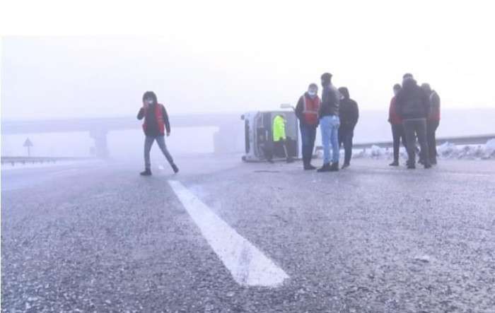 Alınan bilgiye göre, Çatalca'da sabah saatlerinde buzlanma ve yoğun sisten dolayı İstanbul Havaalanı'na polis memurlarını taşıyan minibüs devrildi.