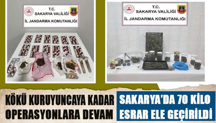 İl Jandarma Komutanlığı ekiplerinin uyuşturucu satıcılarına yönelik düzenlediği operasyonda 70 kilo 675 gram kubar esrar, 608 gram metamfetamin, 75 gram kokain, 5 gram eroin, 903 kök kenevir, 1 kilo 33 gram skunk, 200 gram kenevir tohumu, 428 gram bonzai ele geçirildi. Operasyonda 7 kişi tutuklandı. Operasyona ilişkin yapılan açıklamada; "Sakarya İl J.K.lığı olarak suç ve suç unsurlarının her türlüsüyle mücadelemiz devam edecek olup, çocuklarımızın geleceğini karartan zehir tacirlerine karşı mücadelemize vatandaşlarımızın daha fazla katkı vermelerini bekliyoruz. Çocuklarımızı ve geleceğimizi uyuşturucu illetinden korumayı ancak el ele verirsek kurtarabiliriz. Her ihbar bizim için değerlidir." denildi.