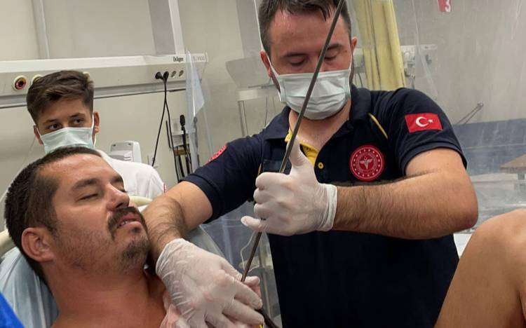İZMİR (İGFA) - Karaburun’da hobi amaçlı balık avlamaya giden 33 yaşındaki Oğuzhan Sonugür, kazara elindeki zıpkını kalbine sapladı. Bir süre denizde kaldıktan sonra arkadaşlarının yardımıyla kıyıya çıkartılan Sonugür, 112 Acil Servis ekipleri tarafından DEÜ Araştırma Uygulama Hastanesi Acil Servisi’ne kaldırıldı. Sonugür'e ilk müdahaleyi yapan acil servis doktorları, çekilen grafide zıpkının 21 cm içeriye girdiğini saptadı. DEÜ Araştırma Uygulama Hastanesi Acil Servis çalışanları, zamana karşı yarışarak hastayı kısa sürede ameliyat için hazır hale getirdi. Daha sonra DEÜ Tıp Fakültesi Kalp ve Damar Cerrahisi’nde ameliyata edilen hasta, burada yapılan zorlu operasyonun ardından yoğun bakım servisine alındı. Başarılı bir ameliyat geçiren Sonugür’ün tedavisine bir süre daha hastanede devam edileceği öğrenildi.