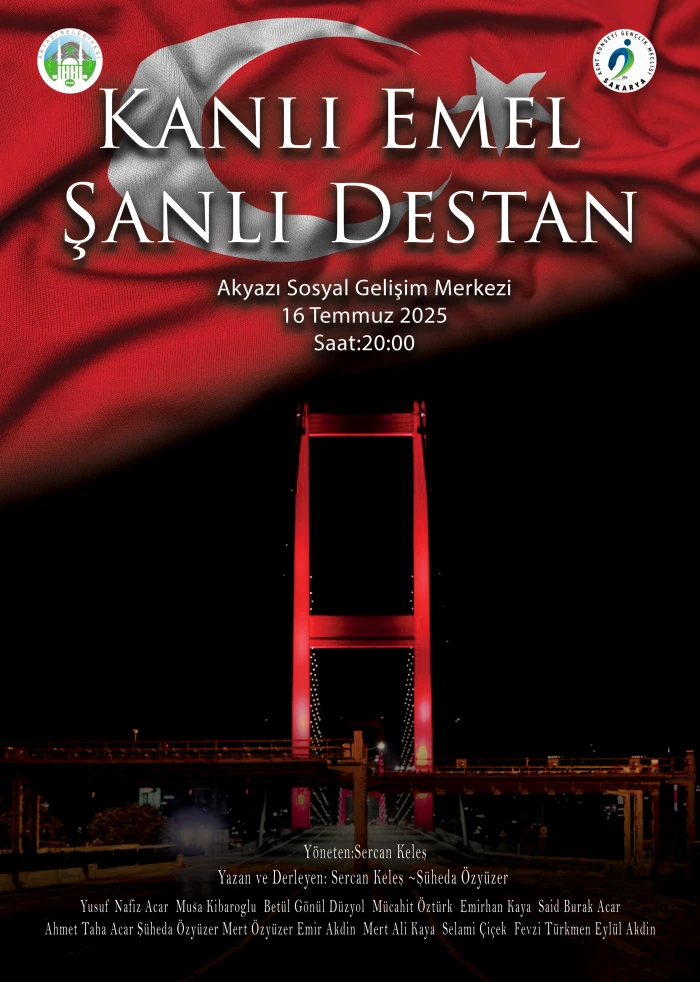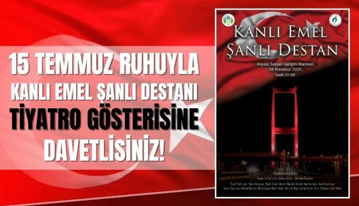 Sakarya Kent Konseyi Gençlik Meclisi ve Akyazı Belediyesi iş birliğiyle, 15 Temmuz Demokrasi ve Millî Birlik Günü etkinlikleri kapsamında özel bir tiyatro gösterisi düzenleniyor. "Kanlı Emel Şanlı Destan" adlı oyun, 16 Temmuz 2025 Çarşamba günü saat 20.00'de Sosyal Gelişim Merkezi'nde sanatseverlerle buluşacak.