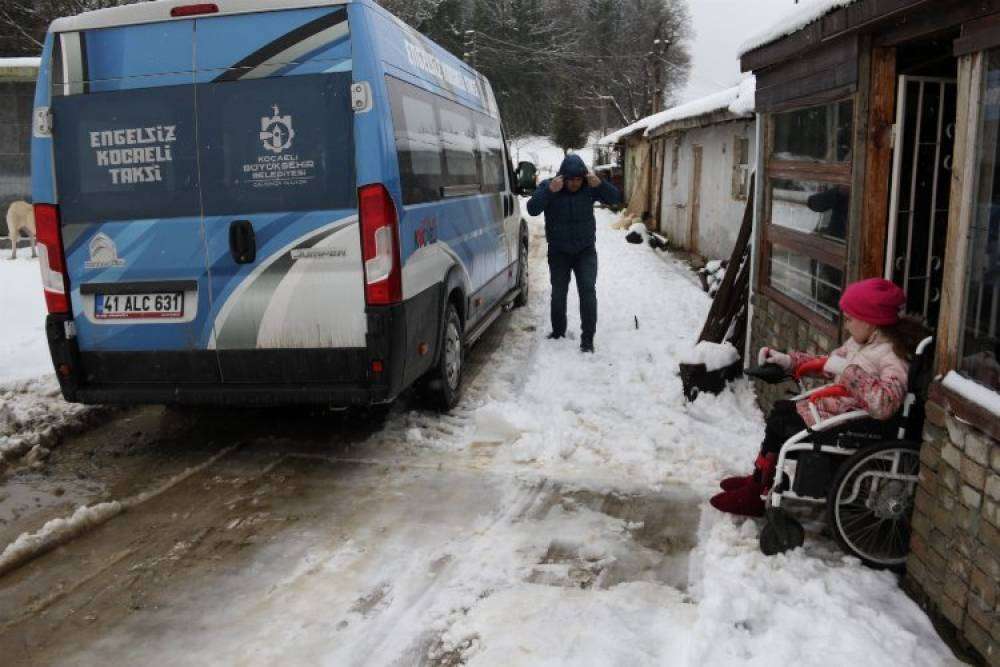 Zorlu kış şartlarında tekerlekli sandalye kullanan engelli bireylerin ev dışında olan zorunlu ihtiyaçları ise yine Büyükşehir’in Engelsiz Taksi hizmeti sayesinde karşılanıyor. Karamürsel Karapınar köyünde ikamet eden Elif Derya da ekipler tarafından alınarak ihtiyaçları karşılandı.