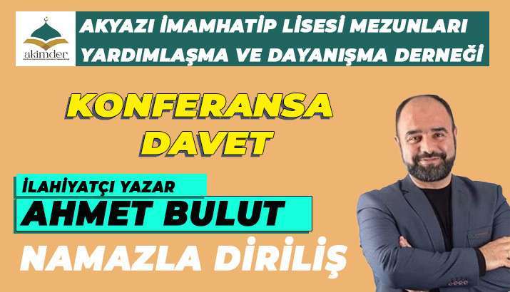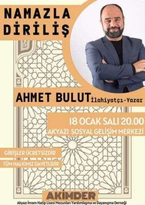 İlahiyatçı- Yazar Ahmet Bulut’un konuşmacı olarak katılacağı “Namazla Diriliş” konulu konferans 18 Ocak Salı günü saat 20:00’de Akyazı Sosyal Gelişim Merkezi Konferans Salonunda Yapılacak.