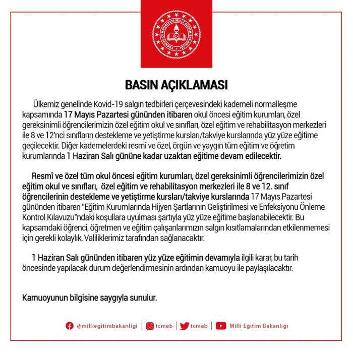 "Ülkemiz genelinde COVID-19 salgın tedbirleri çerçevesindeki kademeli normalleşme kapsamında 17 Mayıs Pazartesi gününden itibaren okul öncesi eğitim kurumları, özel gereksinimli öğrencilerimizin özel eğitim okul ve sınıfları, özel eğitim ve rehabilitasyon merkezleri ile 8 ve 12'nci sınıfların destekleme ve yetiştirme kursları/takviye kurslarında yüz yüze eğitime geçilecektir. Diğer kademelerdeki resmî ve özel, örgün ve yaygın tüm eğitim ve öğretim kurumlarında 1 Haziran Salı gününe kadar uzaktan eğitime devam edilecektir.