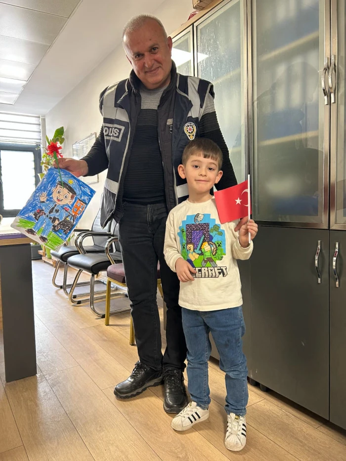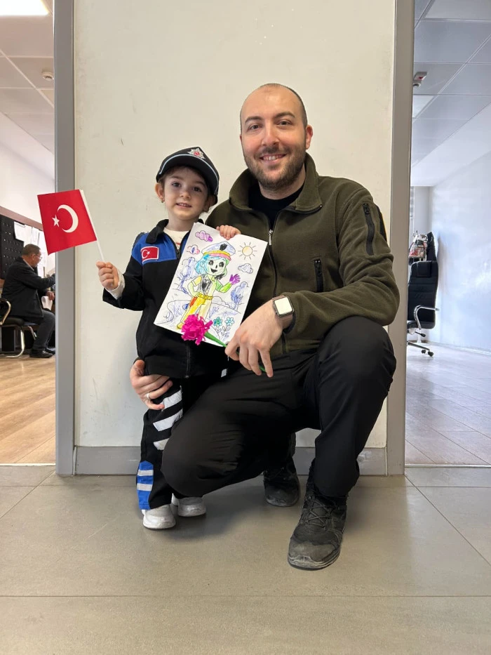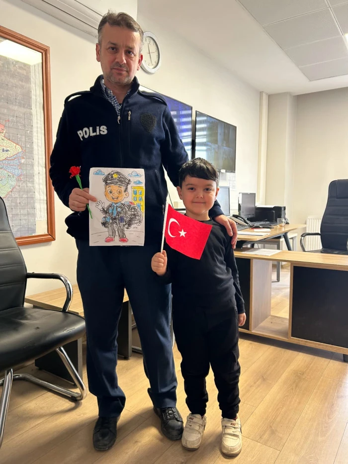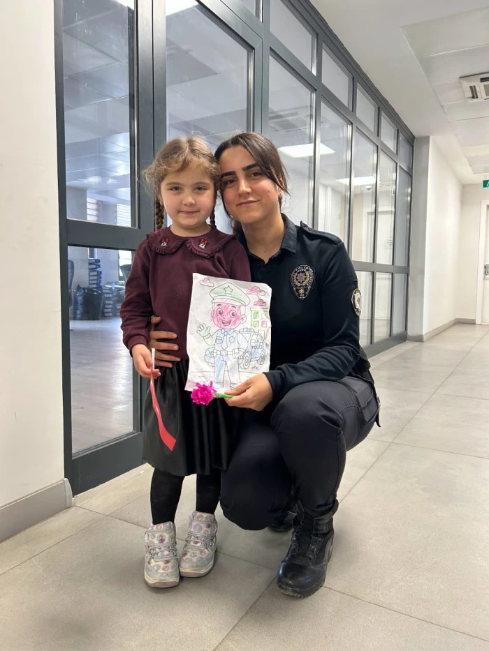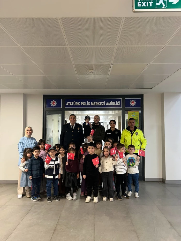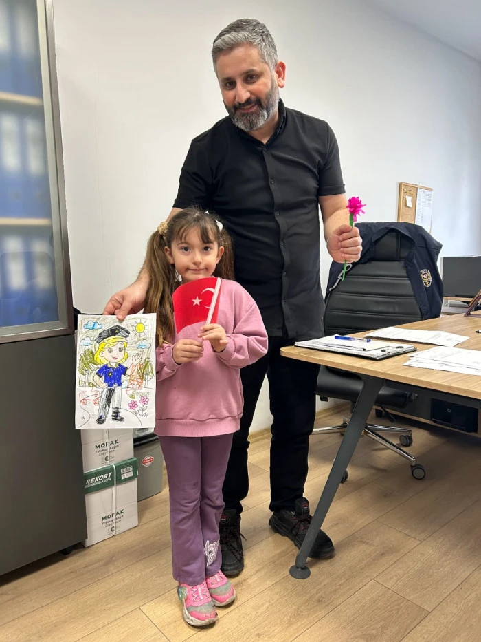 Öğretmenleri Özlem Hanım koordinesinde Akyazı İlçe Emniyet Müdürlüğü’nü ziyaret eden minik öğrenciler, polis ağabey ve ablalarına çiçekler ve kendi elleriyle hazırladıkları hediyeleri takdim etti. Ziyaret sırasında emniyet birimlerini gezen ve polislik mesleği hakkında bilgi alan çocuklar, neşeli tavırlarıyla müdürlük personeline moral kaynağı oldu.