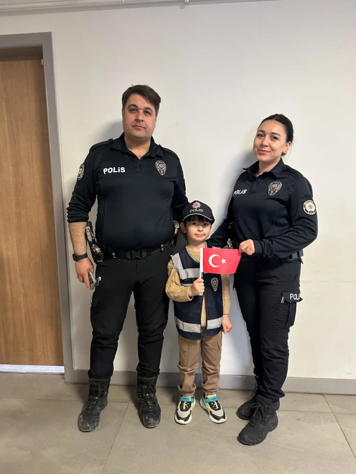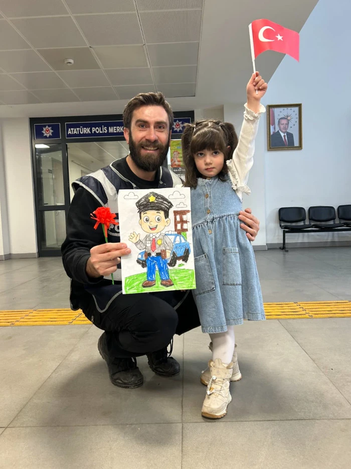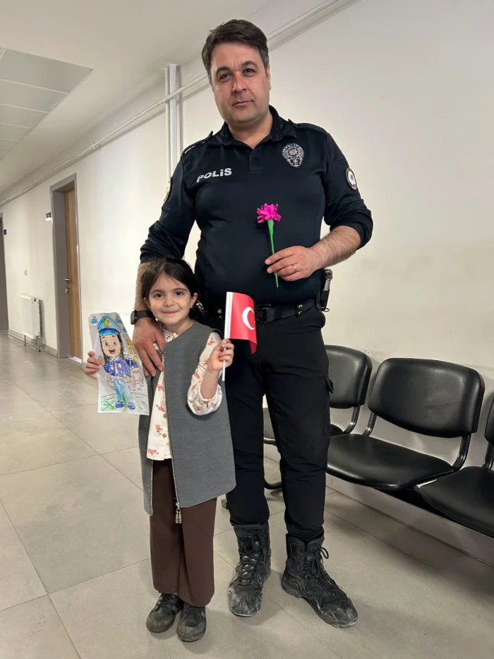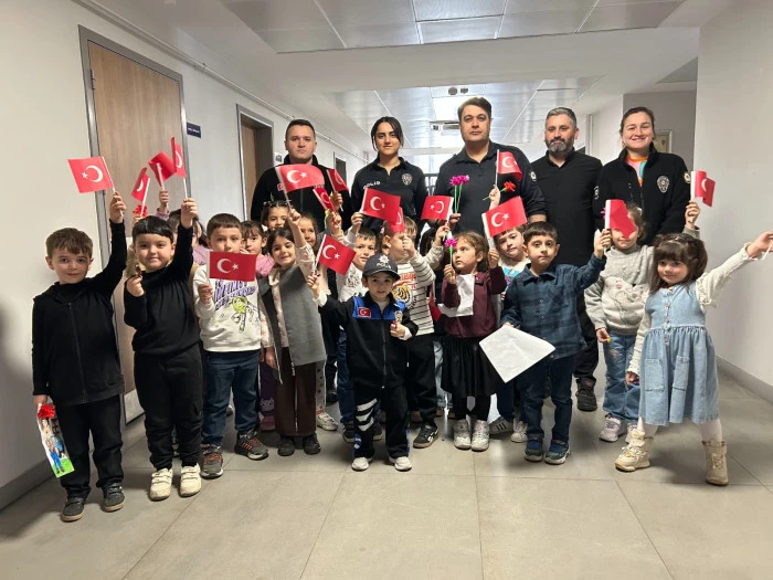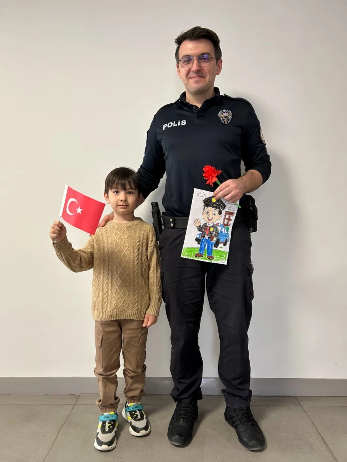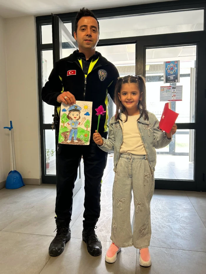 Öğretmenleri Özlem Hanım koordinesinde Akyazı İlçe Emniyet Müdürlüğü’nü ziyaret eden minik öğrenciler, polis ağabey ve ablalarına çiçekler ve kendi elleriyle hazırladıkları hediyeleri takdim etti. Ziyaret sırasında emniyet birimlerini gezen ve polislik mesleği hakkında bilgi alan çocuklar, neşeli tavırlarıyla müdürlük personeline moral kaynağı oldu.