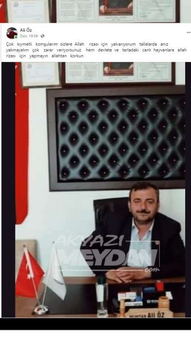 Yağcılar mahalle muhtarı Ali Öz, sosyal medya hesabından çağrıda bulundu Öz yaptığı paylaşımda “Çok kıymetli komşularım sizlere Allah rizası için yalvarıyorum tallalarda anız yakmayalım çok zarar veriyorsunuz hem devlete ve tarladaki canlı hayvanlara allah rizası için yapmayın allahtan korkun” ifadeleriyle sağduyu çağrısında bulundu.