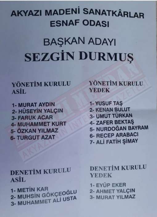 Akyazı Manifaturacılar Kavaflar Ayakkabıcılar Konfeksiyoncular ve Tuhafiyeciler Esnaf ve Sanatkârlar Odası ve Akyazı Madeni Sanatkarlar Esnaf Odası Başkanlığı seçimleri tamamlandı.