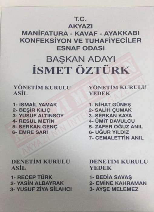 Odada yapılan olağan genel kurulunda Akyazı Manifaturacılar Kavaflar Ayakkabıcılar Konfeksiyoncular ve Tuhafiyeciler Esnaf ve Sanatkârlar Odasına İsmet Öztürk yeniden başkan seçilirken ve Akyazı Madeni Sanatkarlar Esnaf Odası Başkanlığında Sezgin Durmuş’ta güven tazeledi.
